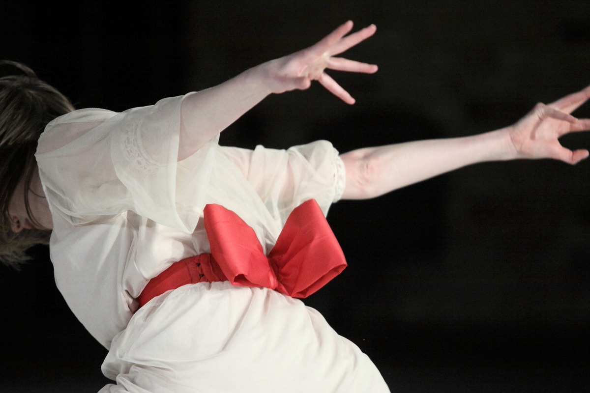The lights slowly fade up on a young woman in a flowing white lacy dress, red bow at the waist, and shiny grey hi-top sneakers. She stares vaguely into the audience, moves forward, then jolts like little insects are squirming about inside her torso and limbs, controlling every squirm until it becomes fluid and repetitive in a dizzying array of movement.This is Aleksandra Borys’ Lost in Details, a dance exploration inspired by Alice in Wonderland. At first, her idiosyncratic character moves in a world of expansive silence; the only sounds are her breath and her joints clicking in and out of specific gestures.During a section of floor work the character’s world becomes more alive and vivid. The music and lights do their own dance for her; a clock strikes triggering shifts between light and shadow. Eventually the dance and the music become one when slow melodic electric guitar accompanies Borys as she writhes to stillness and the lights flash about her.No specific narrative is clear in this solo piece, though one might see the connection to Alice in Wonderland in Borys’ bewildered expressions as she dances. But with realized physicality and a poetic use of space, she communicates the wonderful, whimsical confusion of mythical Wonderland. At all times she maintains absolute control over her body, and while the variety of movement stays in only one or two levels of complexity, she still is a sight to behold.